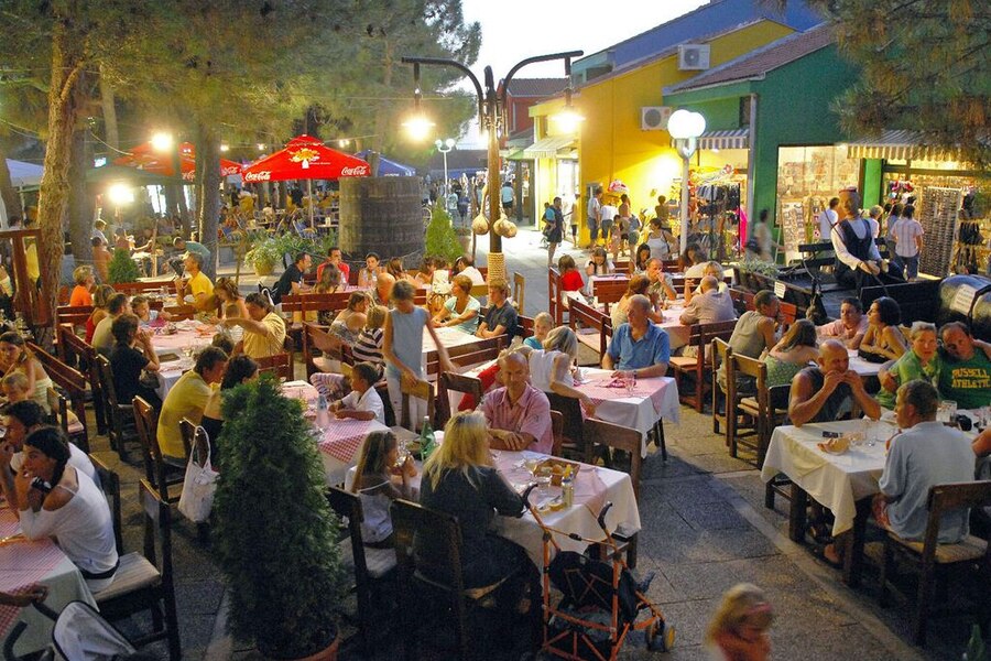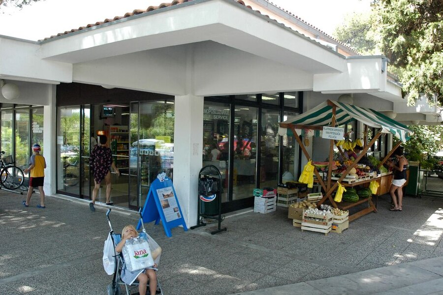 Una cena chic con piatti della tradizione gastronomica croata e un ottimo vino? O una pizza e un gelato? A voi la scelta. Il campeggio ha una bella via commerciale, che arriva fino alla spiaggia. Non trovate solo ristoranti, ma anche piccoli bar e negozi. Volete cucinare voi? Andate ad acquistare il necessario al grande supermercato.
